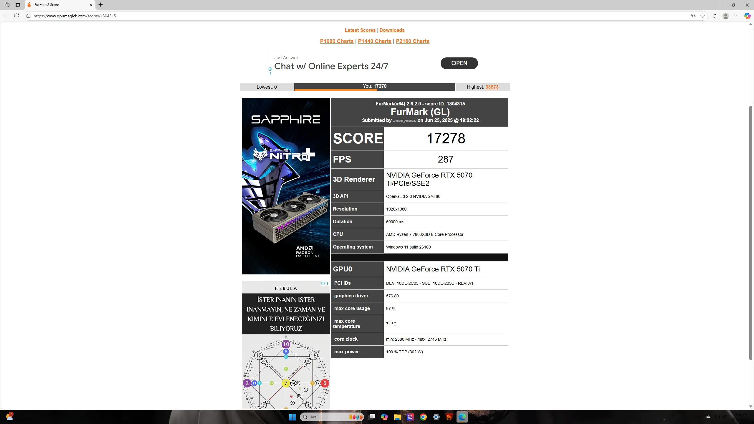 Ortalamaya göre çok iyi duruyor. https://www.geeks3d.com/20250113/furmark-2-benchmark-charts-for-p1080-scores/