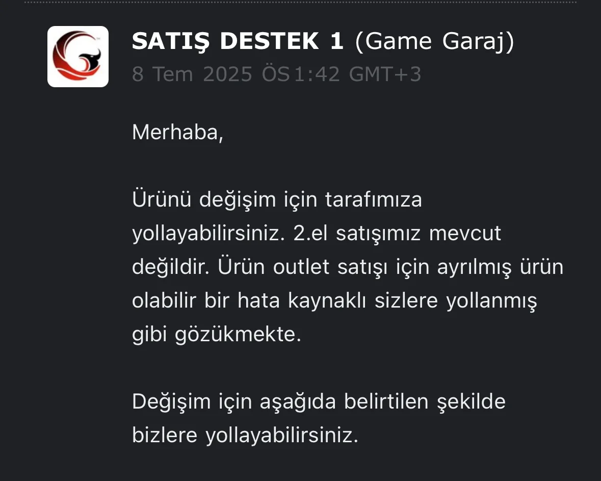 Merhaba arkadaşlar. 4 temmuz günü indirimden gamegaraj üzerinden Palit Gamerock 5070 Ti satın aldım. Ürün gelir gelmez video desteği ile ürünü detaylı bir şekilde açtım inceledim. Ürünün jelatinleri üzerinde değildi ve parmak izleriyle beraber çizikler mevcuttu. Gamegarajın maili üzerinden outlet ürünü gönderdiklerini onaylayıp geri kargolamamı istediler. İsteklerini yerine getirdim ve ürünü kargoladım. Ürün ellerine ulaştığında bana kullanılmamış 0 bir ürün göndereceklerini böyle bir şey yaşadığım için özürlerini ilettiler. Bunda bir problem yok. Asıl problem son attıkları mailde başlıyor. Mailde yeni gönderecekleri ürünün kutusunu açıp ekran kartını poşetinden çıkarıp (sarı etiketi sökmüşler) bu ürünün üzerinde jelatin mevcuttur. Tekrar aynı şeyi yaşamamanız için kontrol edilmiştir tarzı mail attılar. Şimdi gelelim bu sürece. Tüketici sizden 0 ürün alıyor pahalı bir markayı. Siz outlet gönderiyorsunuz. Tüketici size ürünü geri gönderiyor. Siz tüketiciye 0 ürün göndereceğinizi beyan edip göndereceğiniz ürünün kutusunu açıp ekran kartının jelatin fotoğrafını çekiyorsunuz. Teorik olarak ürün yine açılmış oluyor. Gerçekten diyecek herhangi bir şey bulunamıyor artık bu ülkenin satıcılarında. @Abdullah Hacıgül sizlerin tüketici yanında olduğunu bildiğim için sürece bir göz atmanızı istiyorum. Burada ilerlemeyi nasıl yapalım. Teşekkür ederim. Mail görsellerini atıyorum.