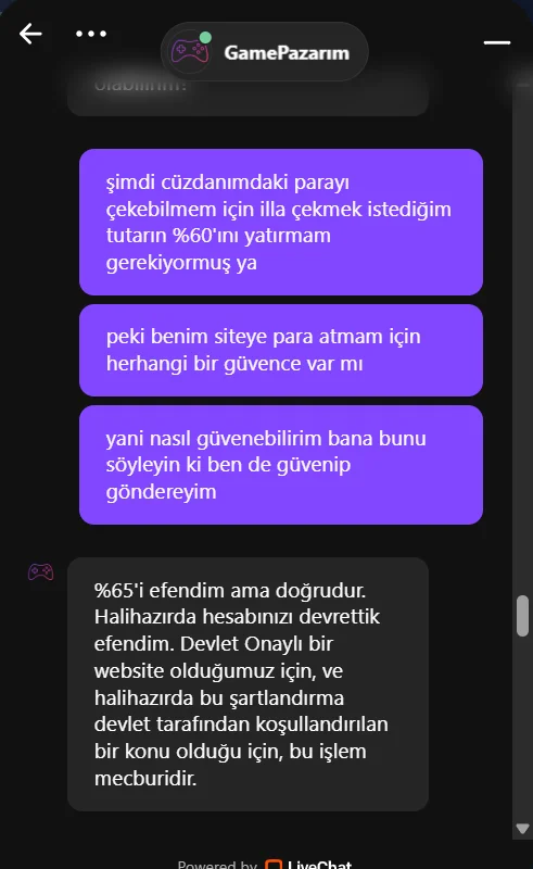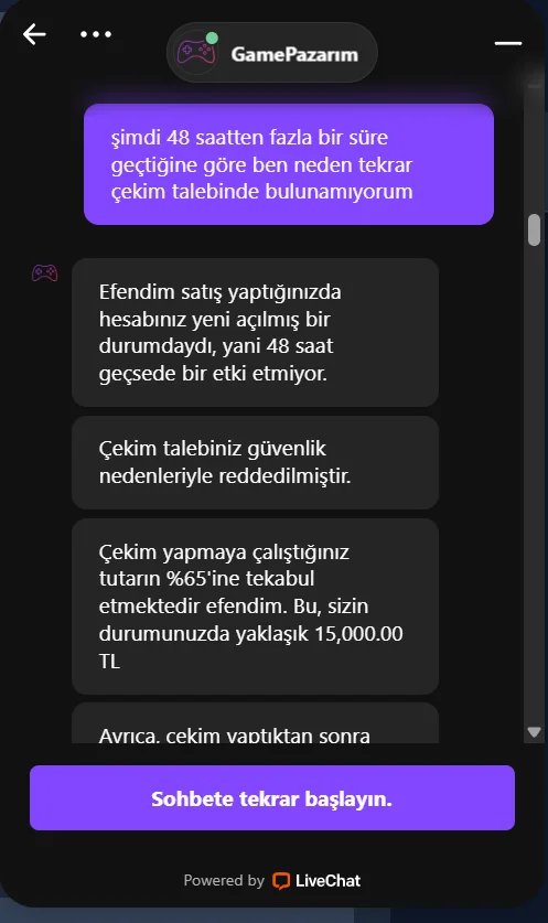 Bu site üzerinden hesap açtıktan yaklaşık 1 saat sonra iki adet item sattım. Toplam tutar olan 21.850 TL hesap cüzdanıma aktarıldıktan sonra paranın tamamı için çekim talebinde bulundum. Çekim talebimin reddedilme sebebini ekran görüntüsü olarak koyuyorum. Daha sonrası ekran görüntülerinde yer salıyor. Benim sizden istediğim yardım şu arkadaşlar: Daha önce bu işlemi yapan var mı, sizce güvenmeli miyim?