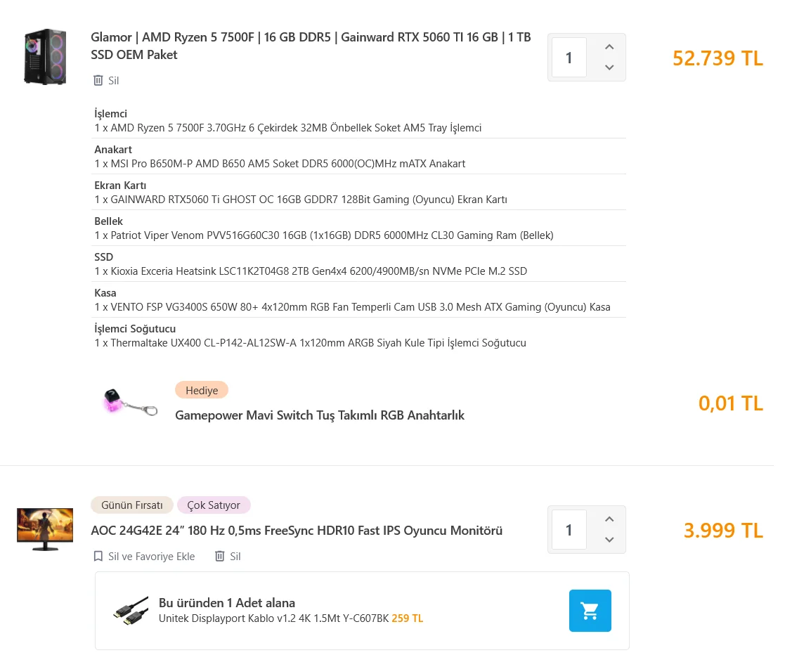 Geçen hafta da birebir aynı sistemi satışa koydular 43-44 bir şeydi yine. Oturup hesapladım en ucuz aynı özellikte parçalarla 45k'ya geliyordu. Şu anda da hesaplayabiliriz yine 45ten aşağı çıkmayacağına eminim. Sistemin psu kalitesiz ssd, soğutucusu, anakartı ise low end o belli zaten ama değiştirip daha iyisini almaya kalkınca 50den aşağıya çıkamıyorsun üstüne ekran kartının kalitesinden feragat ediyorsun. 5060ti 7500fli sisteme 650w +80 bronze yeterli o zaman hesabını yapalım en düşükten: