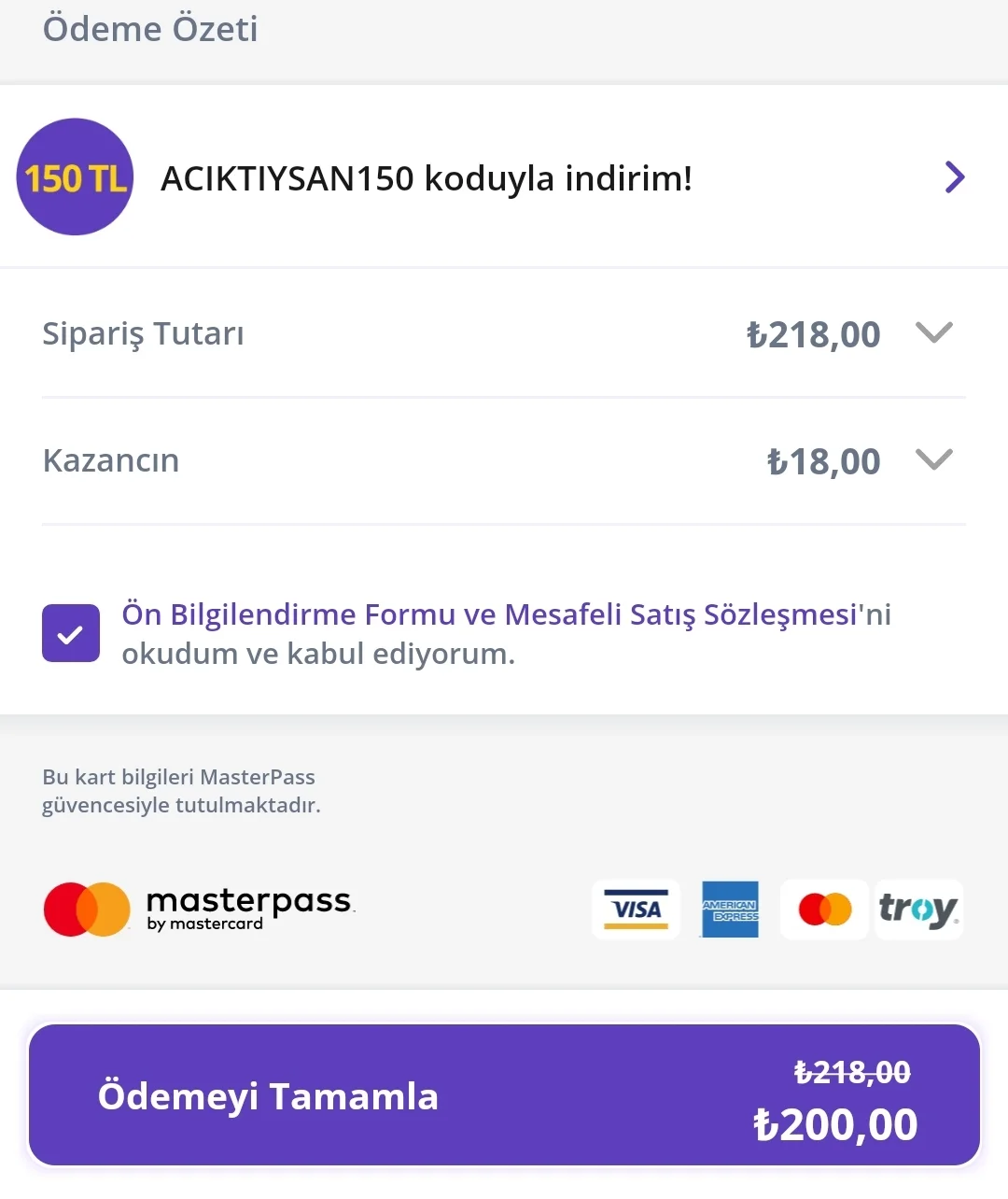 ACIKTIYSAN150 kodu min 350 TL sepet limiti koymuş, ACIKTIYSAN200 kodu ise eklendi diyor ama maalesef çıkmıyor kampanya sayfamda :(