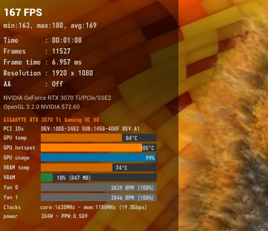 TEST SÜRESİ 2 KATINA CIKMASINA RAĞMEN FAN HIZLARI %20 DÜŞÜŞ YAŞADI SICAKLIKLAR İSE 85 DERECE KART GÜÇ DÜŞÜRMÜŞ HALİNDE CALISIRKEN SUAN 69 DERECE MAX OLUCAK SEKILDE TAM GUCUNDE CALISIYOR ORJINALINDE BILE BU KADAR SOGUK DEGILDI. HOT SPOT SICAKLIGI İSE TAM 27 DERECE DUSTU