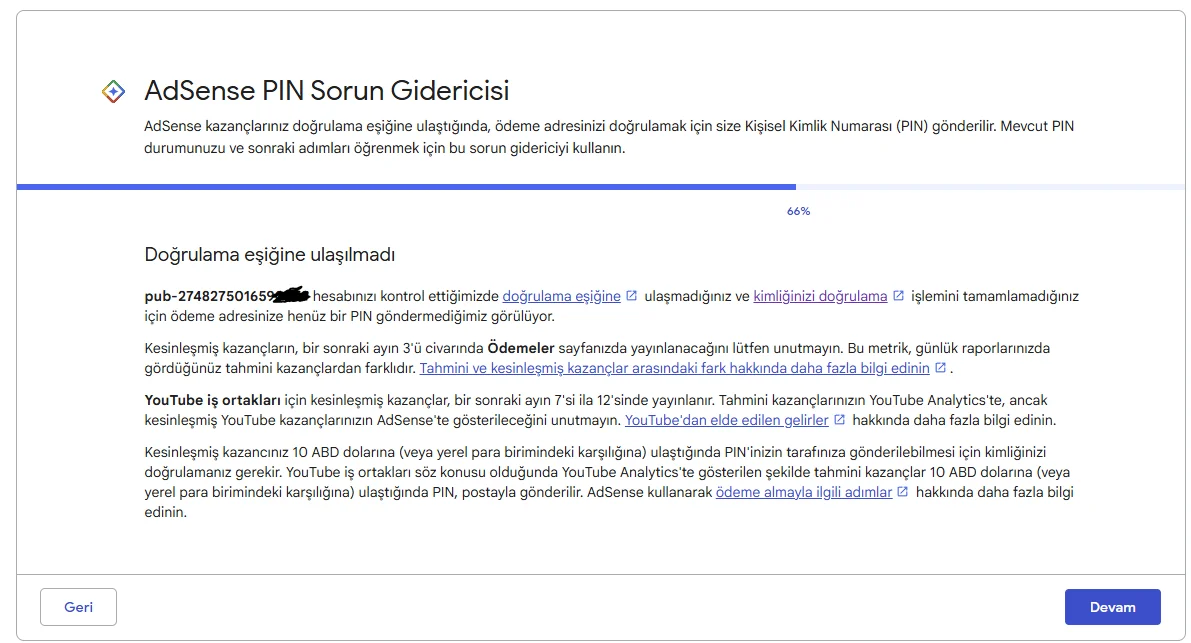 Merhaba, adsense adres doğrulaması için 3 kere pin istedim 4.'sünü dün istedim ama halen manuel doğrulamam açılmadı. Pin sorun gidericisine girdiğimde böyle bir yazı çıkıyor, yardımcı olabilecek varsa sevinirim