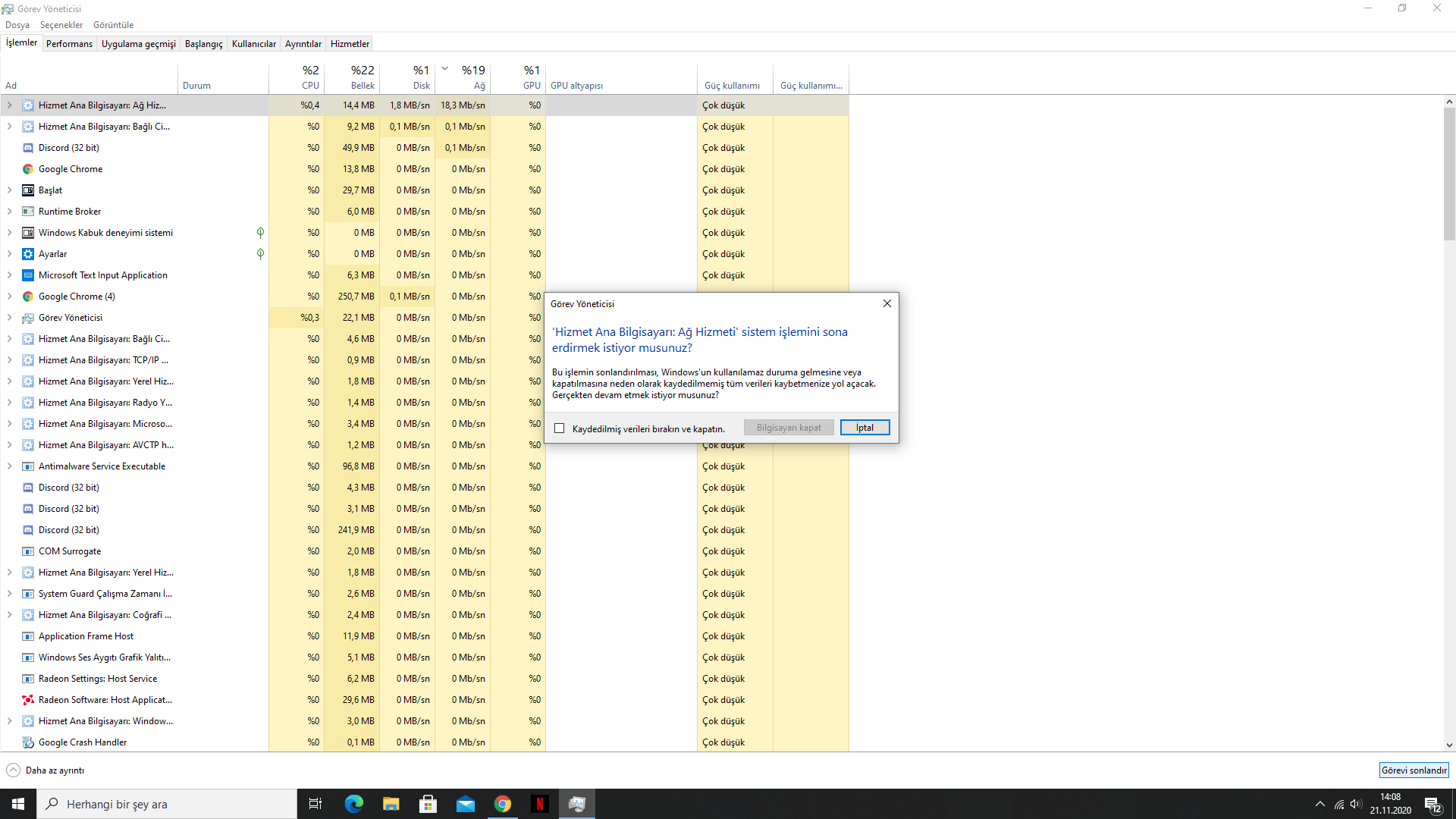 Görev yöneticisini açıyorum ağı kullanan hizmetleri büyükten küçüğe sıralıyorum orda hizmet ana bilgisayarı: ağ hizmetleri %15 ağ kullanıyor görevi sonlandır diyeceğim zaman ekteki hatayı veriyor son günlerde pingim valorantta 300-400lerde geziyor