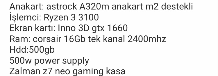 Hocam peki ne kadar eder bu sistem bu haliyleDostum buradaki herkes çok bilmiş olduğu için doğru dürüst öneri çıkmaz sen 2. El sitelerini incele fiyat ortalamasını al ve ona göre yaz. Zaten kartın ederi en az 4000 civarı. Sistemin çöp vs değil yükseltilmeye ihtiyacı var.