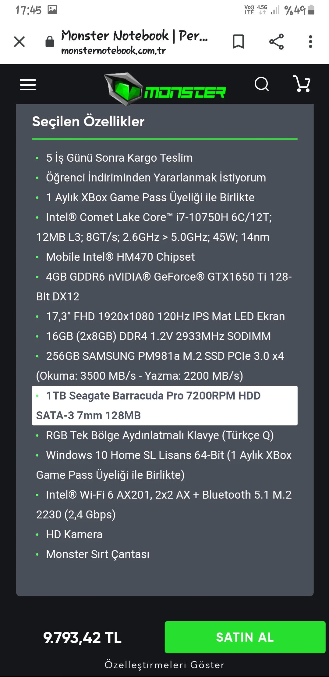 monsterın da bu fiyata 2060 lı notebooku var tek farkı 15.6 inç ben de 17 inç takıntılıydım ama 15.6 aldım az gelmiyor hoca merak etme yazık edersin parana sırf 17 inç olsun diyeAlıntıyı görüntüleAlıntıyı görüntüle baktığım model bu i7 10750h