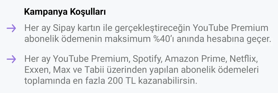 Not 2: Sipay gibi bazı kartlar toplam 200₺ veriyor. Yani Netflix, Spotify, YT Premium kullanıyorsunuz. 3 platform için toplam 200₺ Cashback kazanirsiniz. Her platform için ayrı ayrı 200₺ vermez.