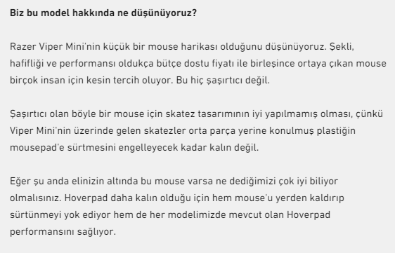 Benim çok dikkatimi çekmemişti ama burayı okuduktan sonra fark ettim. Buradaki bilgi tamamen doğru mouse orta kısmındaki sensörün etrafındaki plastik skatezlerden biraz daha yüksek bu yüzden kaymasını zorlaştırıyor. Skatezleri taktıktan sonra bunu direk anlayabiliyorsunuz. Viper mini şuan yok gibi hissediyorum o kadar fark ediyor. Hatta skatezleri bitik mouselar için çok çok daha anlaşılır oluyor bu durum.