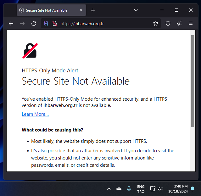 Aşağıdaki ekran görüntülerinde de görebileceğiniz üzere e devlet(turkiye.gov.tr) ve BTK'nın sitesi ihbarweb.org.tr trafiği man in the middle ile değiştirilmeye çalışıldığından "secure connection failed" yani güvenli bağlantı başarısız hatası veriyor.