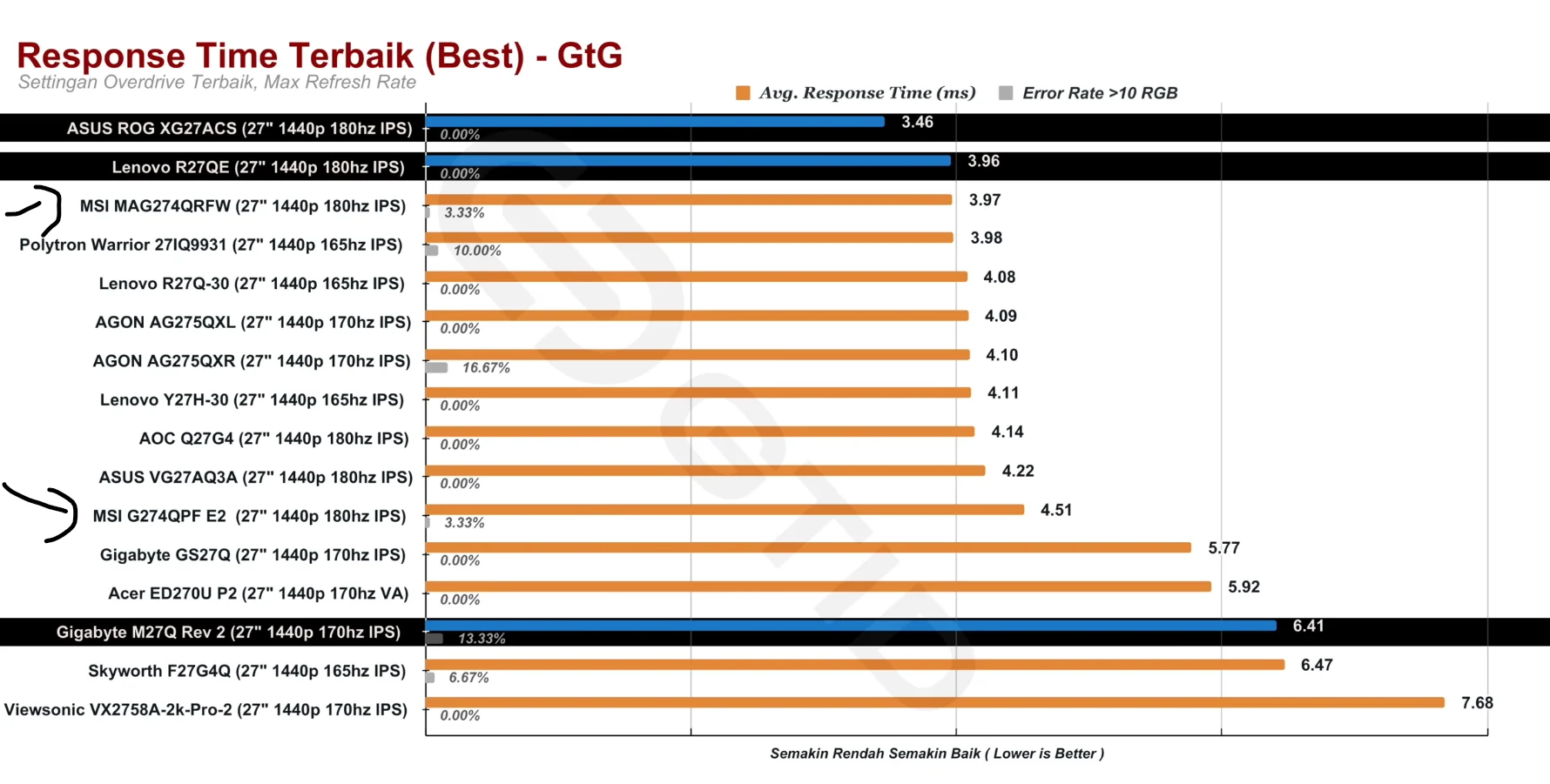 Renk açısından msi bir tık daha iyi. Maksimum parlaklık lenovo çoğu incelemede 360nit civarı çıkıyor. Msi ise 500nit çıkıyor. Lenovo birazcık daha hızlı. Kontrast açısından da lenovo biraz daha iyi. İkiside direkt üstün sayılmaz. 500nit olması sizin için gerekli değilse ve 360nit yeterli diyorsanız lenovo bir tık daha mantıklı olur.