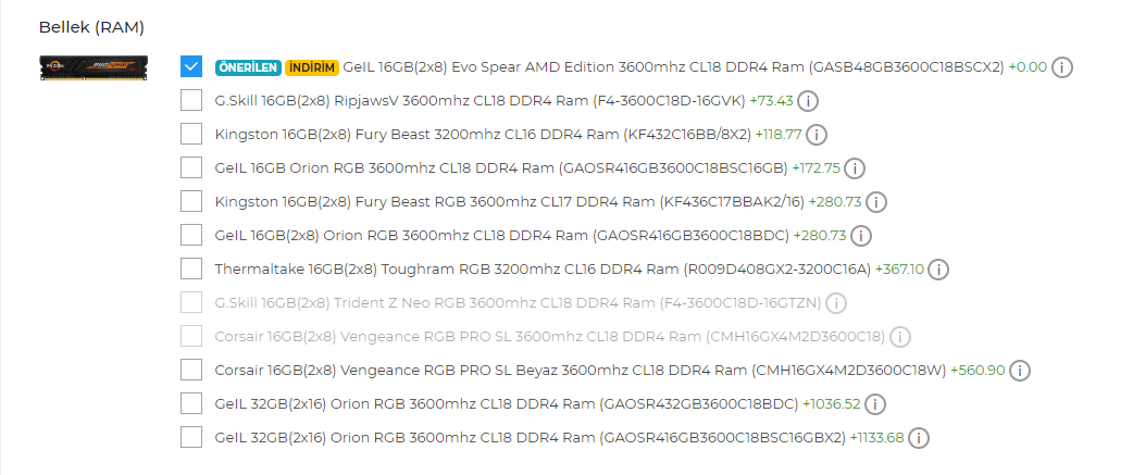 Merhabalar, sinerji bilgisayardan sistem alacağım ve hazır sistemde bellekte bunları seçebiliyorum. RX 6600 XT / Ryzen 5 5600x / Gigabyte B450M S2H 3600mhz(OC) M.2 AM4 mATX Anakart'a hangi belleği tercih etmeliyim F/P olarak yardımcı olabilir misiniz? ve neden neye göre tercih ettiğinizi yazabilirseniz sevinirim.