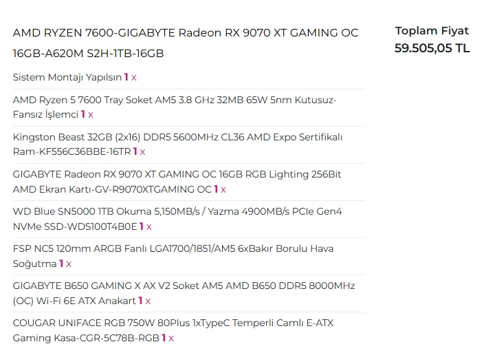 59.600 tl yapıyor 1 tane daha ram alırsan işini görür anakartı biraz yüksek aldım 9700x felan takarsın ileride