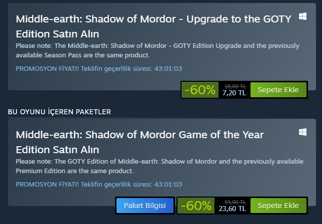 Ben çevirdim aslında ama yine de sormak istedim. Steam'de direkt Mordor oyunu yok çünkü, oyun sayfasında bunlar var. Yani oyunu oynamam için 23TL'lik paketi mi almam lazım?Hocam 7.20 TL'lik olan oyunun kendisine sahipseniz aldıktan sonra GOTY versiyonuna güncelliyor , 2. olan ise direk GOTY versiyonlu hali yani 2. olan oyun kimse ingilizce yazıları çevirmemiş galiba.