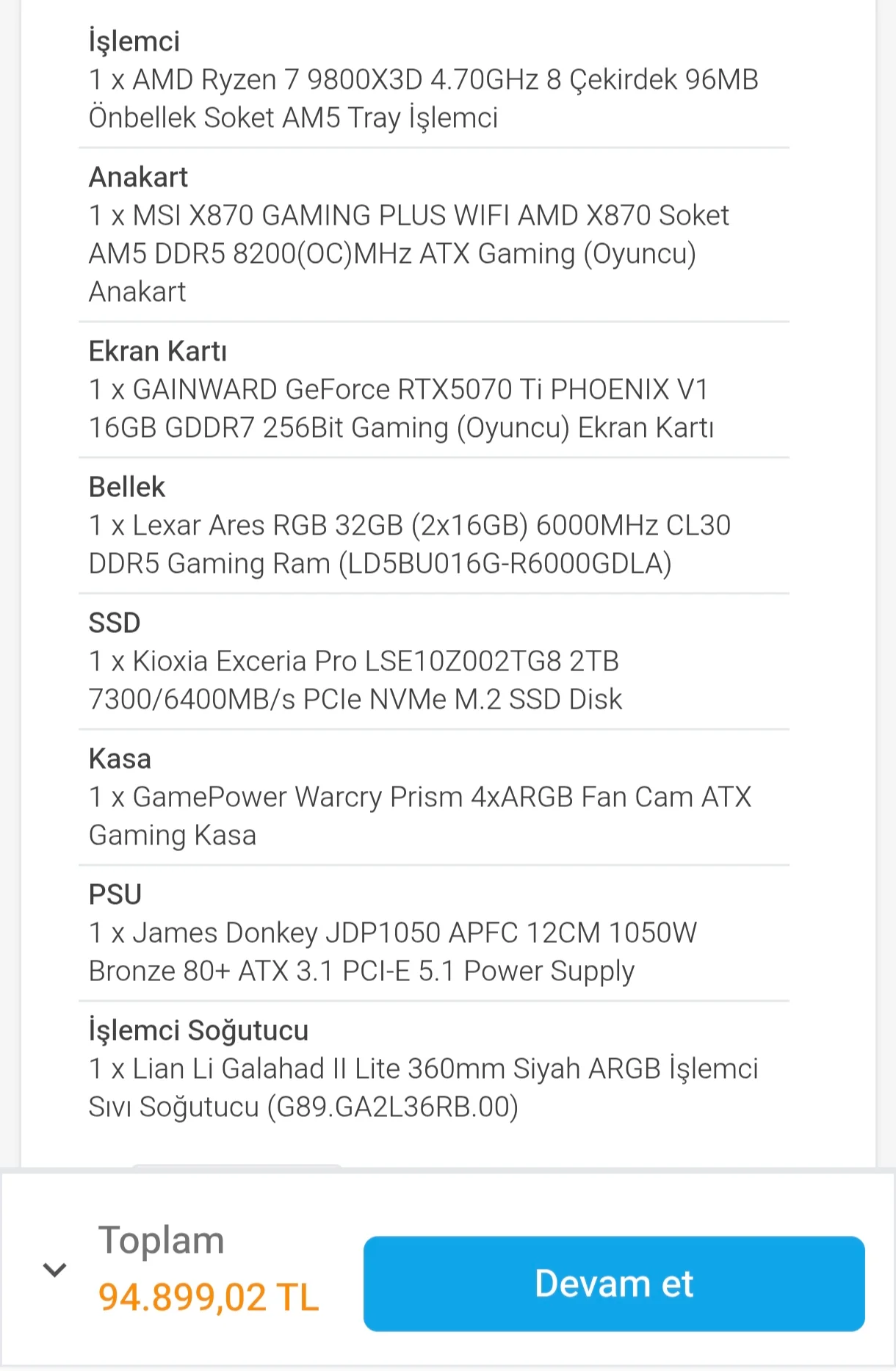 Hazır sistem bakmaktan yoruldum hangisine karar vereceğim bilmiyorum tek sistem içinde parça farklı birinde 5080+7800x3d belki bir delilik yapıp 9800x3d yaparım digerinde 5070 ti 9800x3d sizce hangisini almalıyım veya başka bir hazır sistem öneriniz varsa bekliyorum İleride yükseltme yapabileceğim bir kasa uzun yıllar kullanmak için tam alıyım iyi olsun önerilere açığım anakarttan anlamam bazi forum yorumlarinda gördüm yorum sizin klâsik oyunları oynarim LoL,CS,pubg,cod,rainbow,GTA,valo falan her oyunu yüklendiğimde sorunsuz full ayarlarda oynamak bu fiyatı ödüyorum uzun zamandır oyun oynamıyorum her şey aldıktan sonra belli olacak daha uyguna varsa hazır sistem beklerim