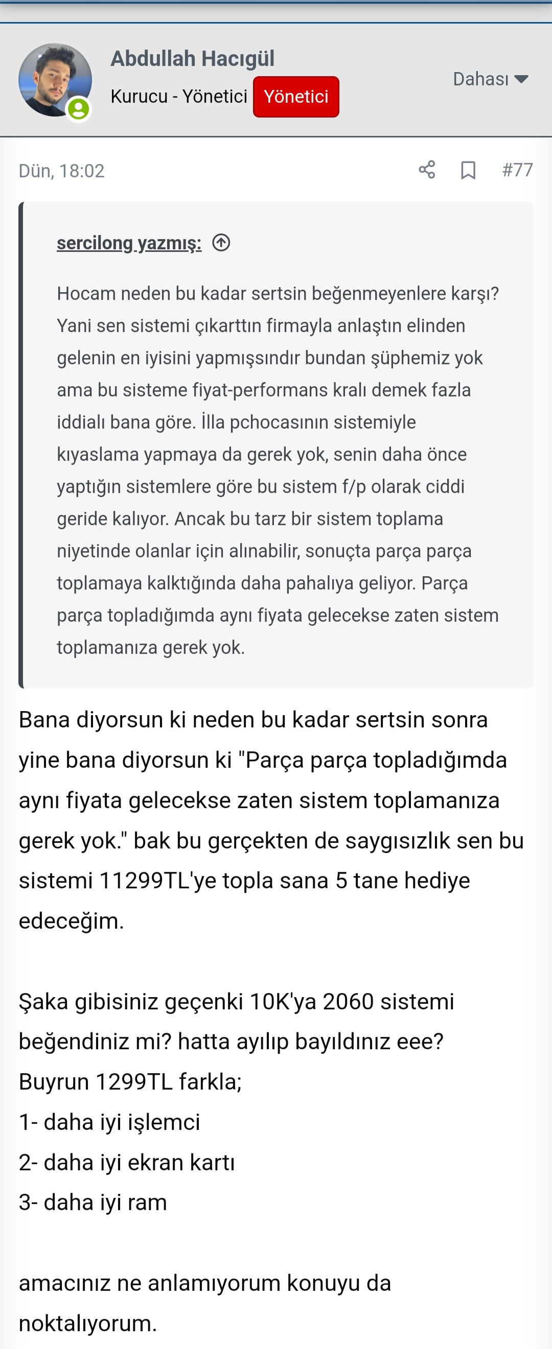 Bakın öyle bir hale getirdim ki sizi düşünebiliyor musunuz rakibi yok ama 2K indirimi olan sistemi beğenmez hale geldiniz. Size ölü fiyattan sistem yapınca ne oldu biliyor musunuz? Stoklar 1 saniyede tükendi ışık hızında tükenince yine geldiniz kızdınız hakaret ettiniz, geldiniz konu açtınız buradan da hakaret ettiniz inanmadınız işler uzayınca konuyu kitleyip yine konu açıp yine kızdınız ne için ölü fiyattan sistem sunduğum için sizin düşündüğüm için ben kötü oldum, yine hızınızı alamadınız youtube'da anonim hesaplarla küfür ettiniz ne için stoklar bitmiş olduğu için. Ben size "hayır fiyat çok iyi hepsi eksiksiz sattı" dedim siz yine inanmadınız ekşi sözlüğe gidip her şeyime hakaret ettiniz.