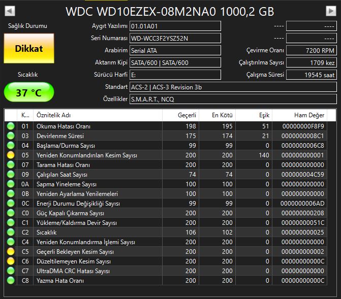 Şuan 12 tane var. Bad sector olma ihtimali gösteren de 2-3 tane gözüküyor. Önemli verileri bu diskte saklamayın.