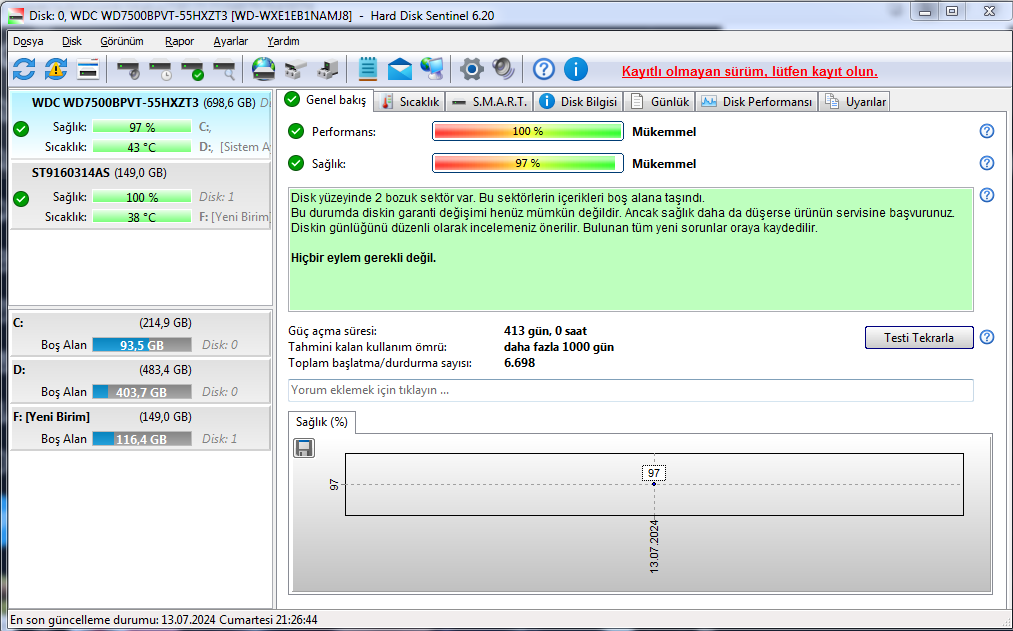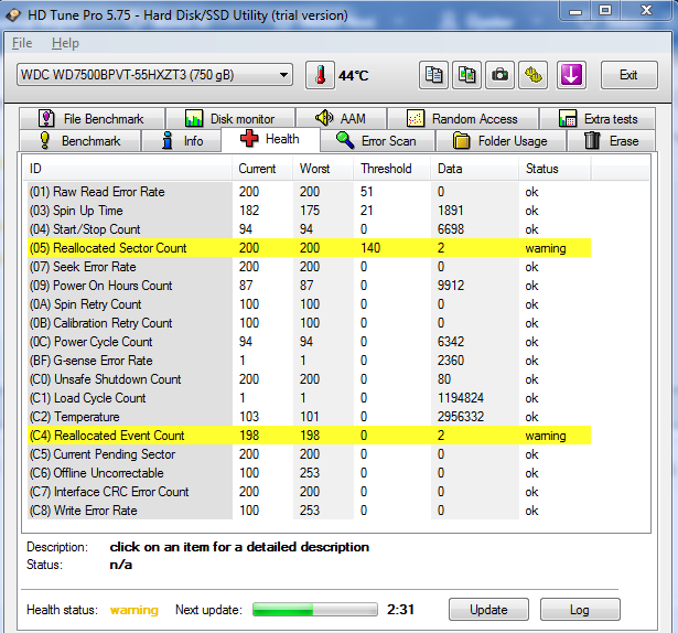 Harddisk sentinel ile sağlığına bakar mısın. Burda sorun görünmüyor 2 tane bad varmış yerine yedek sektör atanmış görünen bu.