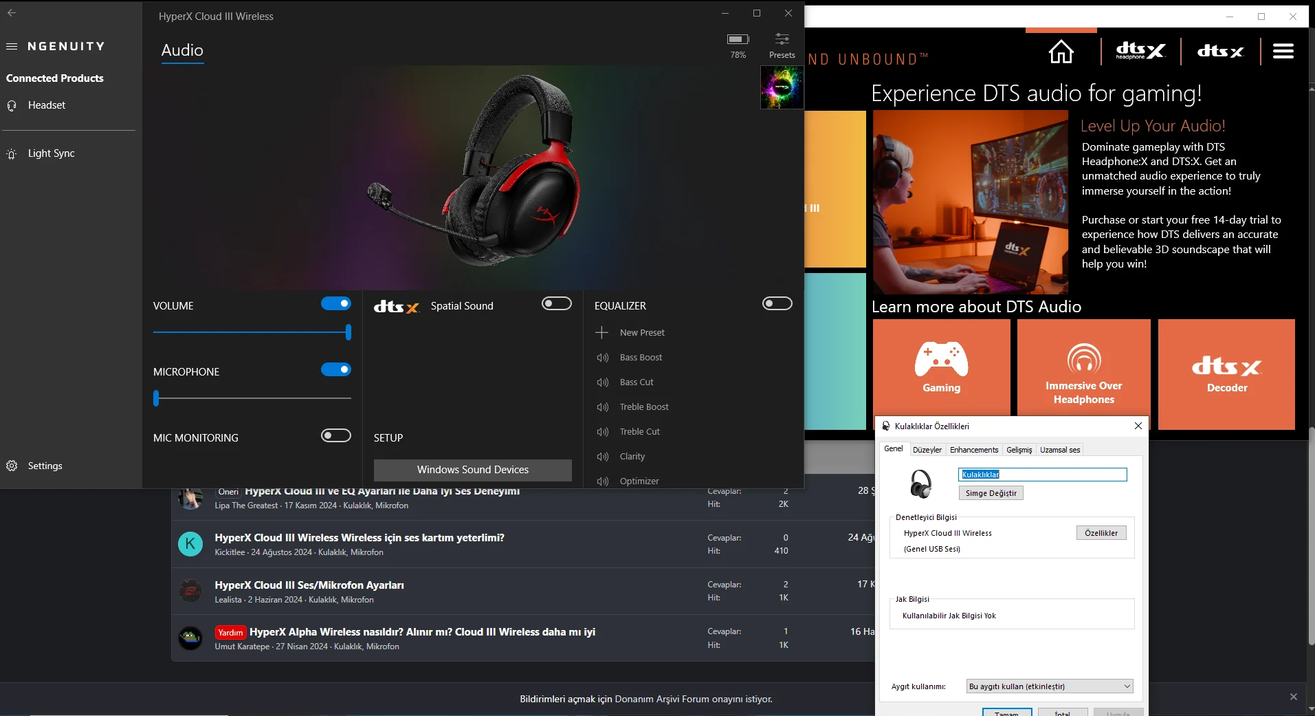 İyi forumlar, HyperX Cloud 3 Wireless ürünü bugün elime ulaştı, cihazın sürücüsünü kurdum ve tavsiye edilen ayarları yaptım. Ses seviyesi gayet iyi fakat rekabetçi oyunlarda mümkün değil ses kasamıyorum. Sağı solu ayırt etmek mümkün değil ayak sesleri sadece arkadan geliyor gibi. Müzik kısmında da denedim normalde ryhtm gitarlar ve leadler biri sağdan baskın biri soldan baskın olmak üzere gelir fakat bunda da aynı durum. Nasıl çözerim bilemiyorum birçok forumda konusu açılmış ama ben bir türlü çözemedim. Ürünün kusurlu olduğunu düşünmeye başladım artık yarın da çözemezsem iade etmeyi düşünüyorum.