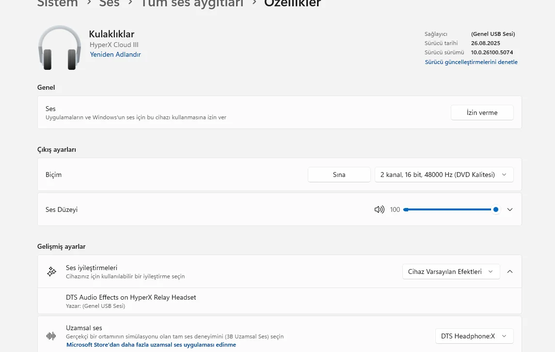 ben default kullanıyorum ayarları atarmısınız birde öyle deneyeyimcloud 3 kullanıyorum oyunculuk için mükemmel bir kulaklık genel kullanım için çok uygun değil örnek veriyorum müzik dinlemek fakat bunların önüne geçmek çok basit dts x ve unbound kurarak müzik kalitesini uçuruyorsun , eq ayarı yapmadan sesi biraz rahatsız ediyordu ngenuity kendi yazılımı üzerinden eq ayarı yapılabiliyor çok basit , mikrofonu benim gibi sesli sohbet amacı ile kullanmak için fazla fazla yeterli ve kaliteli , ben fiyatı ucuz iken almıştım 2000-2300 civarı çok iyiydi , gelelim sevmediğim yanlarına arkadaş bu kadar iyi kulaklık yapıyorsun deri pad var uzun saçlıyım kafamı ve saçlarımı inanılmaz kötü kokutuyor , ter yok fakat havasız kaldığı için kokutuyor ve kaşındırıyor.