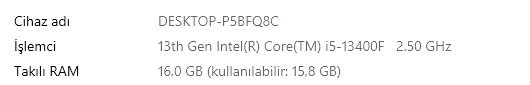 Ekran kartı: Rtx 3060 (tam model ismini bilmiyorum.)