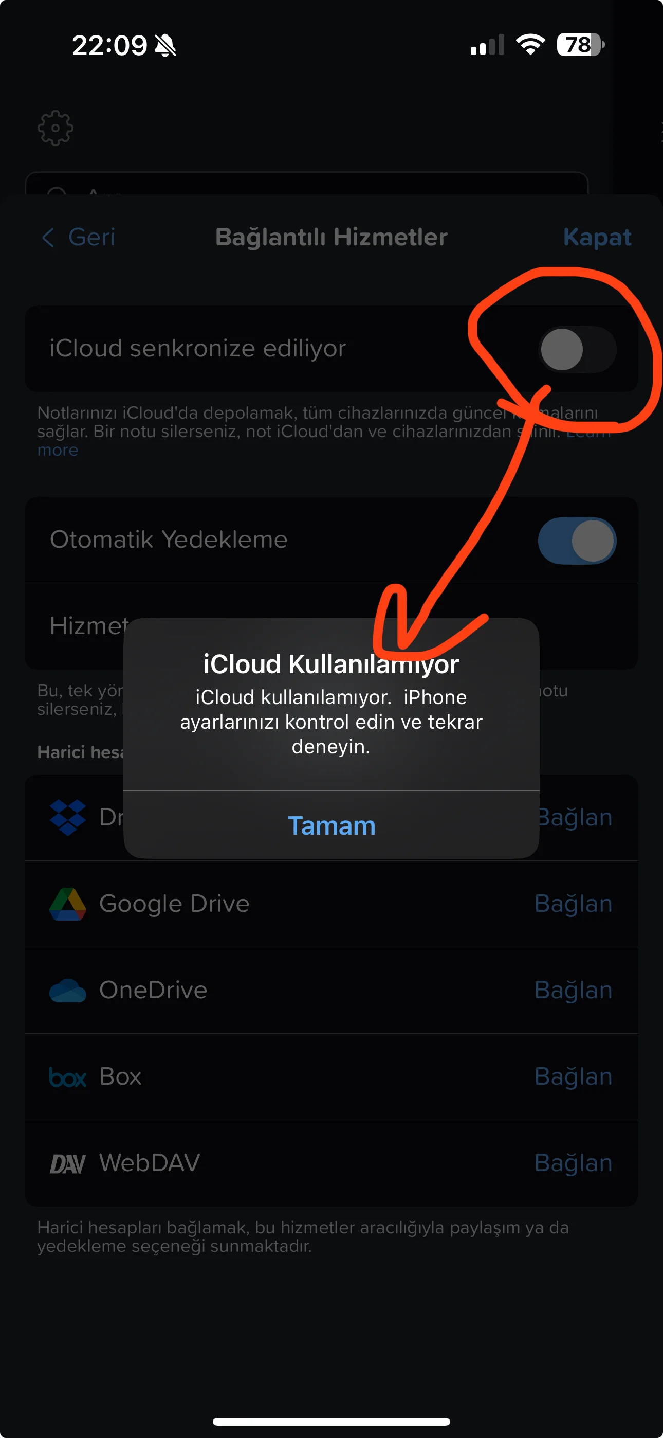Merhaba, dün akşam ICloud'um da yer açmak için bazı uygulamaların yedeklerini sildim sonra not uygulaması olan Notability'e girdim iclouda bağlanılamıyor gibi hata verdi baktım ki notlarım da gitmiş sonra ayarlardan “icloud senkronize ediliyor” butonunu kapatıp tekrar açayım dedim açmak istediğimde fotoğraftaki hatayı alıyorum 1 gündür çözemedim önemli notlarım da vardı