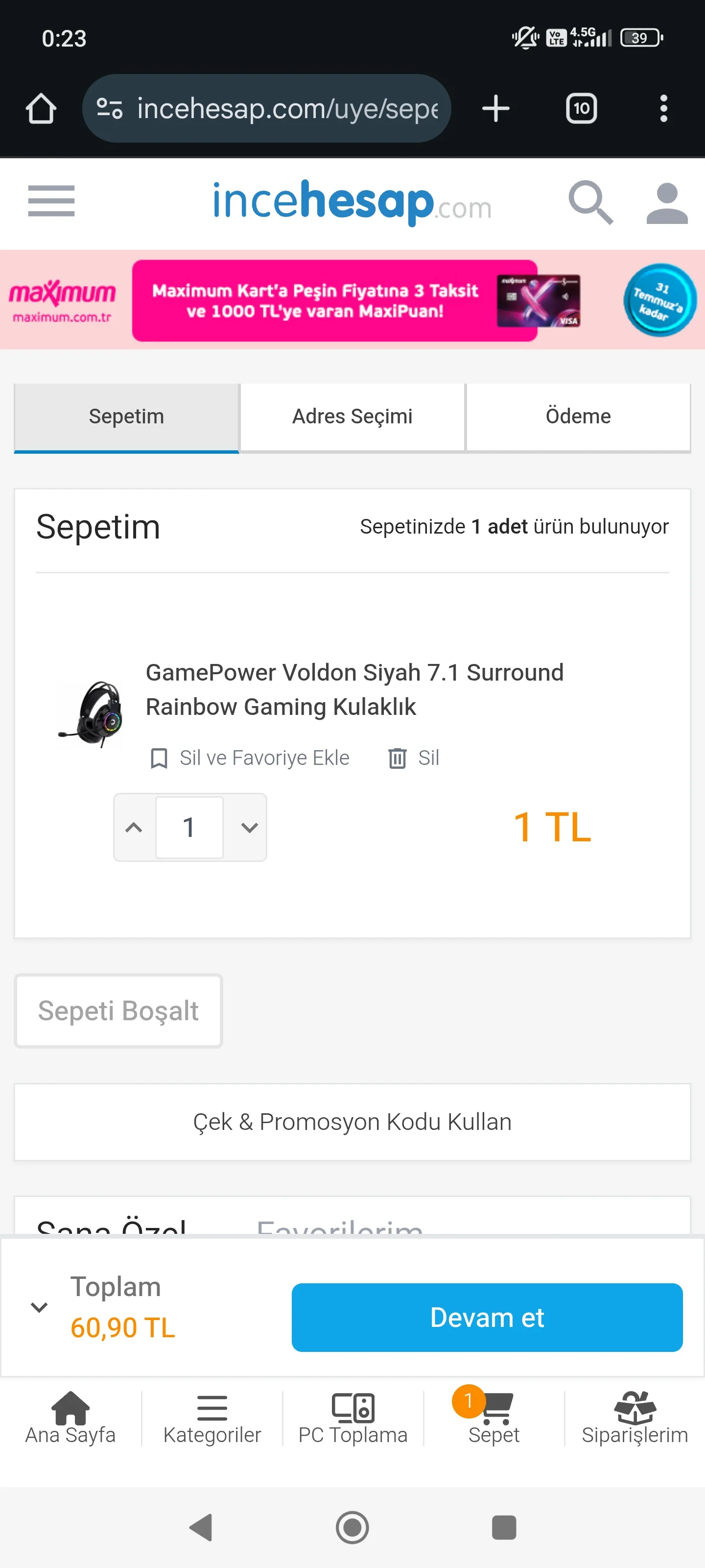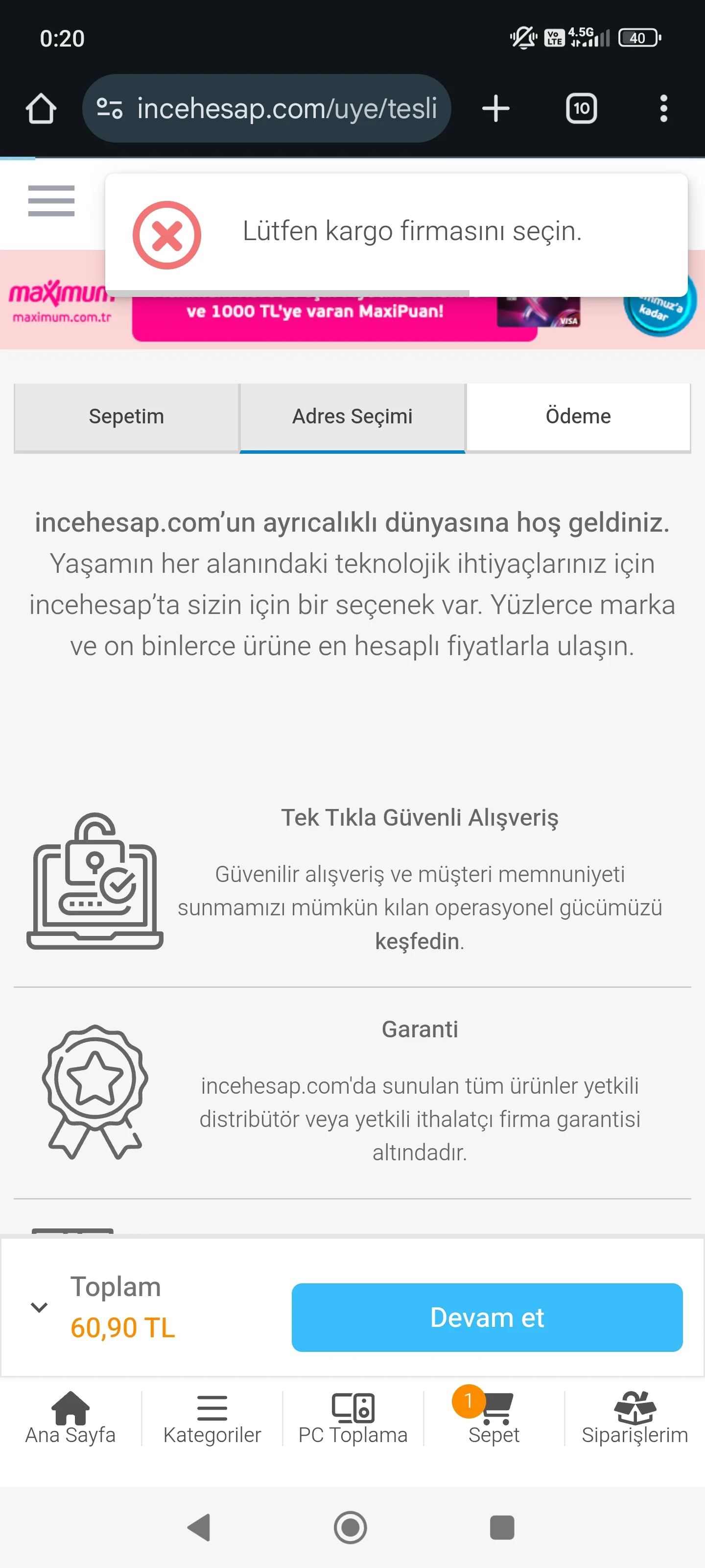Tam 30dk uğraştım ama alamadım ödeme adımına geçemedim ha bire adreste takıldı kaldı stok bitince direk adres geldi 😊 ( sonuç alamadım )