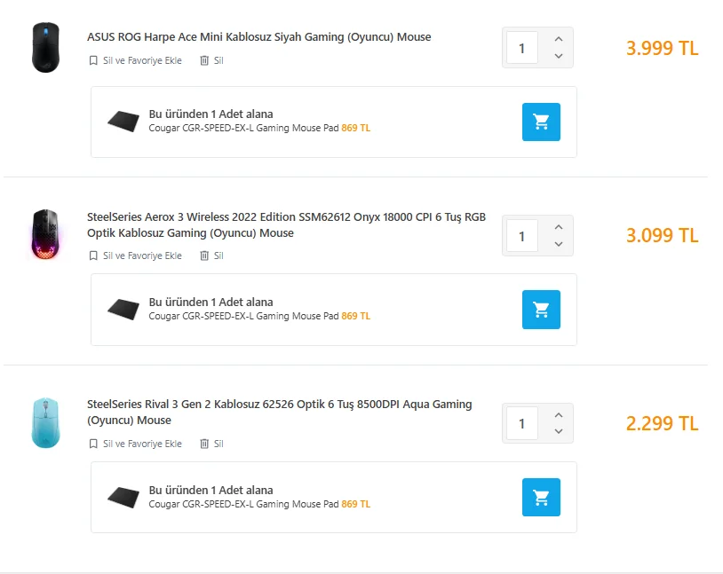 İndirim gibi indirimMouse bakıyorum diye mouseları sepete ekleyip beklemiştim 3099 tl olan mouse 3089tl'ye indi desem.....