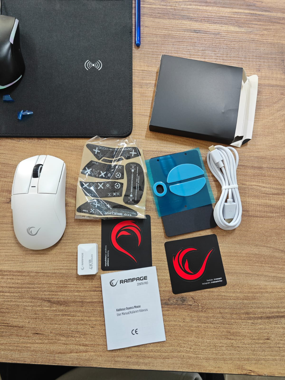 Ürünün kutu içeriğinde : Kullanım kılavuzu , 2 adet sticker , tam skatez 2 adet , grip tape , 4k alıcı ve kablo.