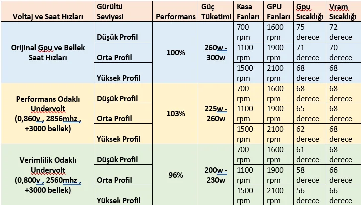 Son olarak bu testlere stres testlerini dahil etmedim, çünkü stres testleri undervolt işlemi yapılsa dahi kartın sınırlarını zorladığı için oyunlardaki değerinden yüksek güç çekiyor. Test ettiğim oyunların ortalama sıcaklık değerleri alınmıştır. Sıcaklıklar daha düşük olabilir ama daha yüksek olmaması için genelde değerleri yukarı yuvarladım.