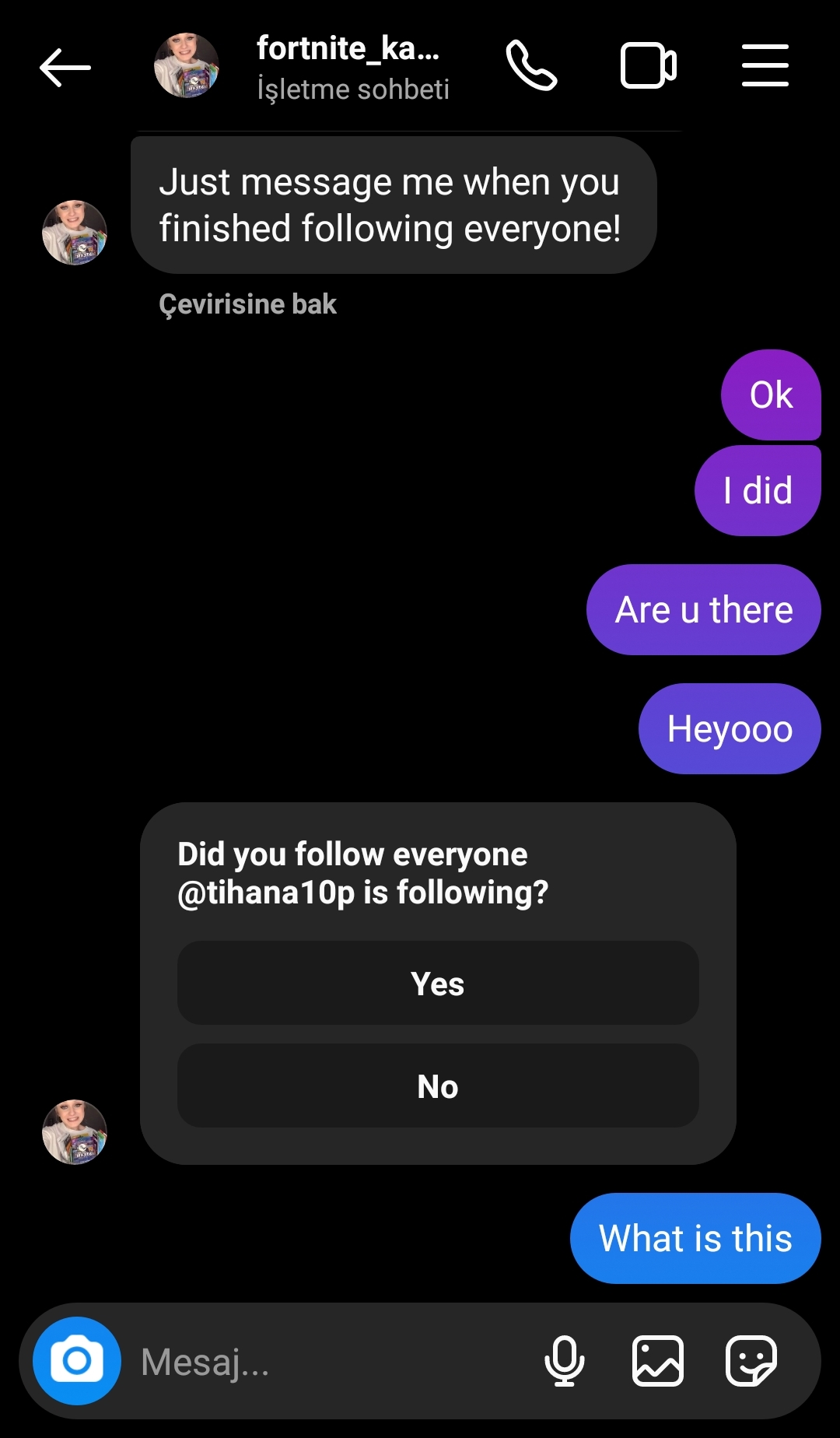 yes no butonunda bi sıkıntı yok gibi sanki amaMerhaba arkadaşlar bir kişi sana fortnite hesabı vericem diye bir sürü kişi takip ettirdi sonrada takip ettin mi diye böyle anket gibi bir şey attı tabikide birşeye basmadım ne yapmalıyım dolandırıcı mı bu?