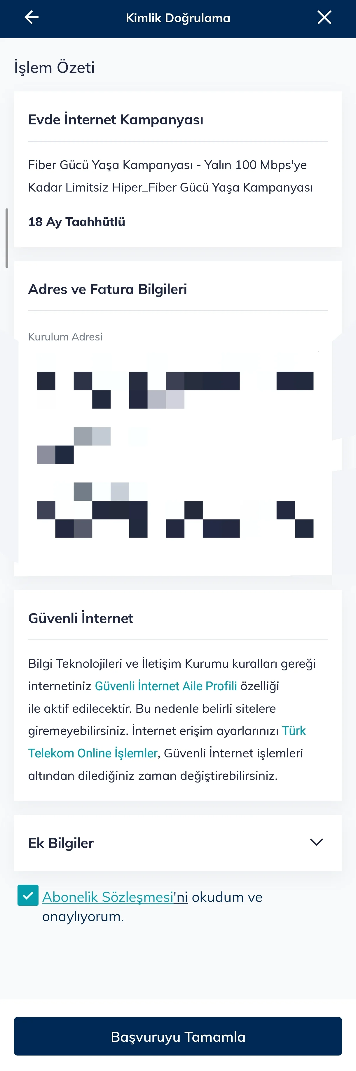Daha geçen haftaya kadar evde başka abonelik vardı. Onu kapattıktan sonra yeni abonelik açmak için başvurmak istediğimde adreste altyapı yok dedi bütün ISS'ler . Sorun boş port olmaması mı acaba binada herkes kullanıyor aslında ama yeni taşınan biriside biriside bizimle aynı problemi yaşıyor. TürkTelekom bana ön başvuruda bulunursam altyapıya bakabileceklerini söylediler. Sözleşme falan imzalamanıza gerek yok sadece kimlik doğrulamanız yeterli, sözleşmeyi altyapı işlemleri tamamlandıktan sonra eğer kurulumu bizden yapmak isterseniz o zaman ıslak imza ile onaylamanız gerekicek dediler. Ama az önce ki lik doğrulaması yaptım son aşamada aşağıdaki sözleşme geldi bunu onaylarsam abonelik yapmış mı olurum yoksa gerçekten dedikleri gibi asıl abonelik kurulum zamanında mı oluyor. Kurulum yaptırmazsanız hiçbirşey ödemenize gerek yok dediler. Ben aslında Türknetten internet almak istediğimi söylediğimde altyapınıza bakılması için ön başvuruda bulunup altyapı geldikten sonra başka firmadan alabilirsiniz. Bu durumda bize bişey ödemezsiniz dediler. Şimdi ne yapayım bunu onaylayım mı yapmazsam altyapıya bakılmayacak sanırım