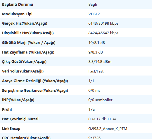benim şuan paketim 75mps hat değerlerim gün içersinde çok değişken bazen ulaşabilir hız 28 oluyor bana gelen 20 bazen ulaşabilir hız 50 oluyor bana 40 bazen ulaşabilir hız 44 oluyor bana gelen 30 bunlar aynı gün içersinde oluyour şu turktelekomdan bıktım vallha istanbulun göbeğinde vdsl altyapıda şu rezilliğe baksanıza bide snr değeri 7.6 7.8 8 berbat yani
