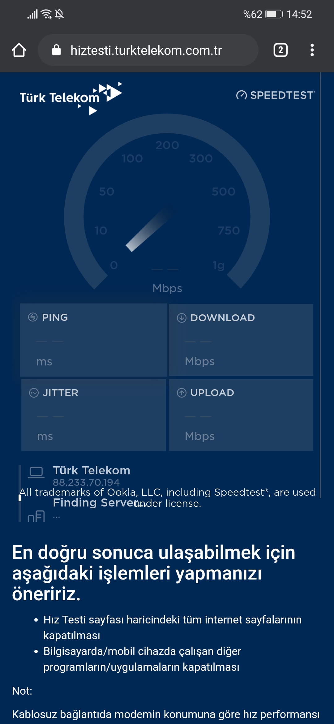 ama işin garip yanı hız testi yapamıyorum. Her siteye biraz beklesem de girebiliyorum ama hız testi yapmaya çalıştığımda ekran ekteki fotoğraf gibi kalıyor