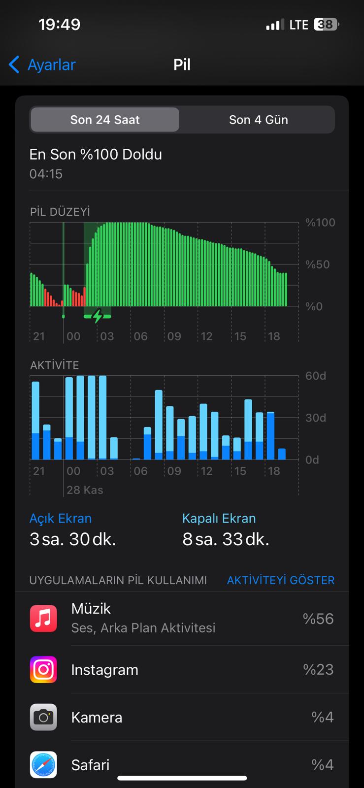 Hocam pil kısmından şarj değerlerini atma şansınız var midir2 gün önce iphone 13 aldım bu sabah şarjdan çektim işyerinde hafif hafif insta wp kullandım bluetooth müzik full açıktı eve yeni geldim şarj 60