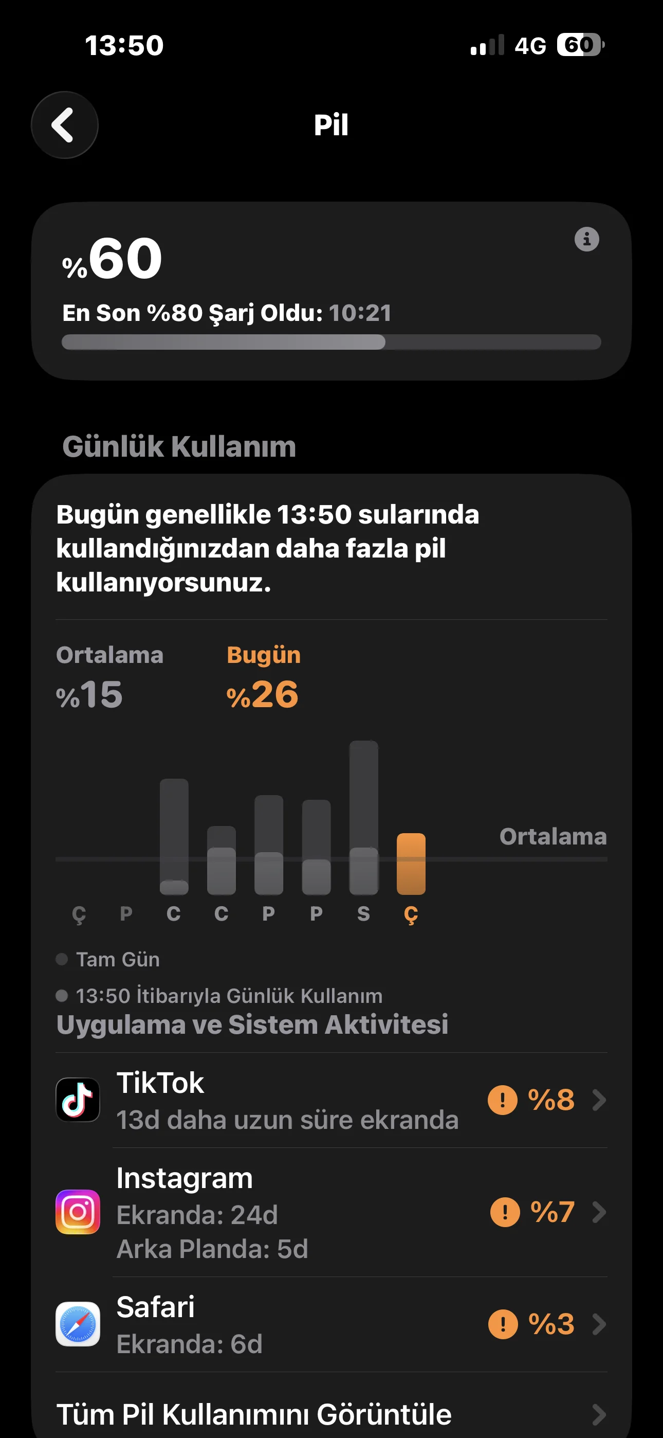 Hocam en optimize pil sağlığı için belirli ayarları yapman gerekiyor. Iphone'da çok fazla uygulama ve yazılım arka planda şarj yiyor. Youtubeda videoları var oradan bakarak yapabilirsin.