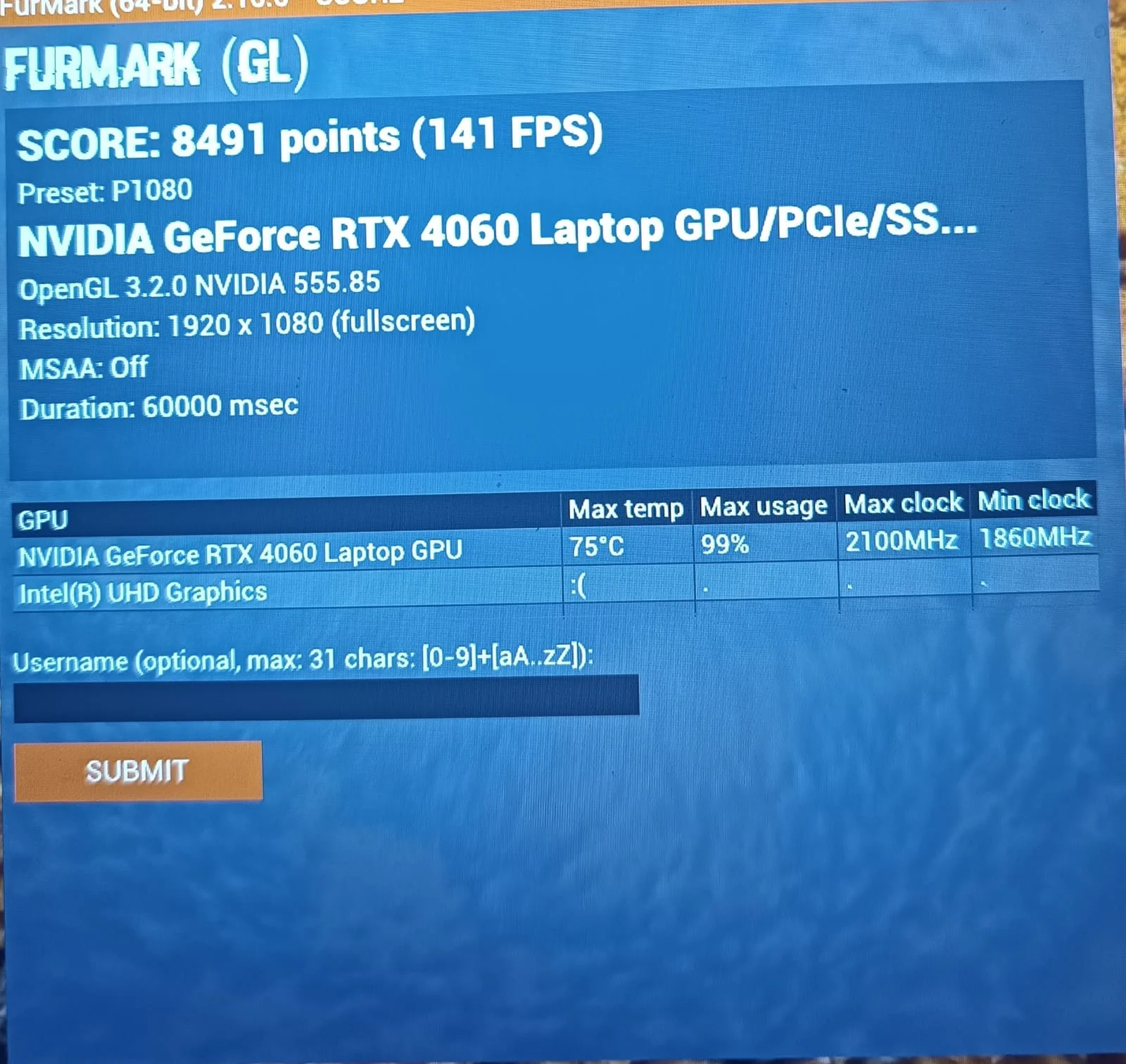 Furmark skorun normal G870 için bu da benim kafamı karıştırdı. Throttlestop veya rivatunner gibi bir program engel mi koyuyor diye anlamak için furmark istedim sizden ama %99 kullanım diyor zaten. Bataryada ya da adaptörde sorun olsa bu furmark skoru da böyle olmazdı. Laptopta sorun var gibi gelmedi bana işlemci için aynısını diyemem isterseniz cinebench r24 skorlarını da paylaşın iyi olur ondada sonuç olumluysa oyunlardan veya oyunların grafik ayarlarından vs. olabilir kaynağı sorunun.