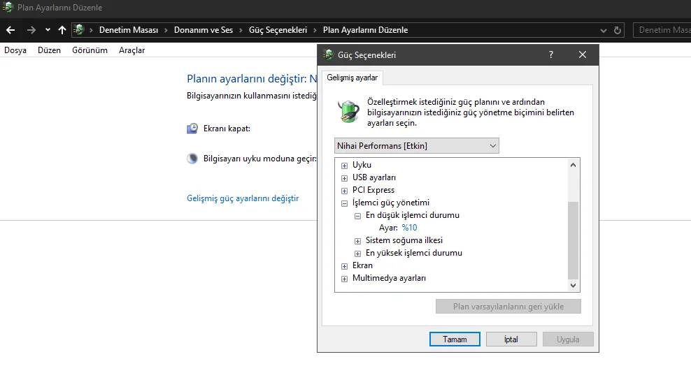 Güç modu dengelide , boşta kullanımı nasıl ayarlıyoruz ?güç planını dengeliye al yada boşta kullanımı %25e çek