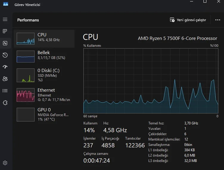 Attığın fotoğrafta %100 değil %14 kullanıyorDostlar bilgisayarıma format attıktan sonra görev yöneticisinden performans sekmesine girdiğimde işlemcinin çok yüksek hızlarda ve %100 şekilde kullanıldığını gördüm bu normal mi? Normal değilse ne yapmalıyım?