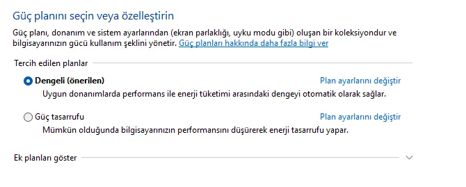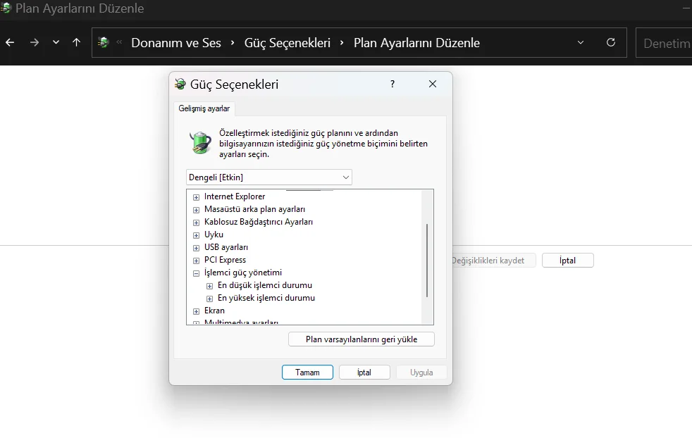 Güç Planı Seçin - Açılan Ekranda Plan Ayarlarını Değiştir - Gelişmiş Güç Ayarlarını Değiştir'i seçin.