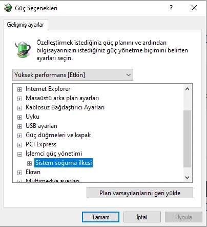 windows 10 kullanıyorum güç seçeneklerinde en yüksek işlemci durumu ve en düşük işlemci durumu gözükmüyor sistem eski biraz o yüzden olabilir mi işlemciyi %100 de çalıştırmak istiyorum