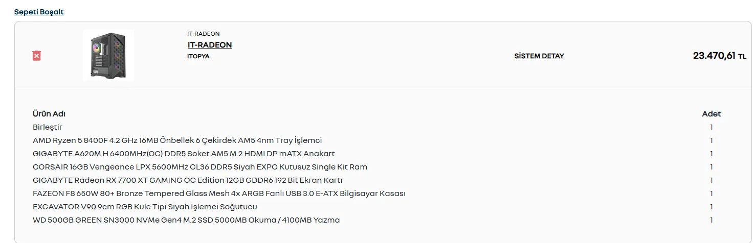 Ram düşürmenin mantıklı olduğu tek sistem olabilir iyi yakalamışsın corsair yapmak daha iyi bence expo varİşlemciyi Ryzen 5 8400F'e düşürüp RAM'i Goodram 16 GB yapınca fiyat 23 bin TL oluyor ve Ryzen 5 5600 RTX 4060 sistem parasına düşüyor.