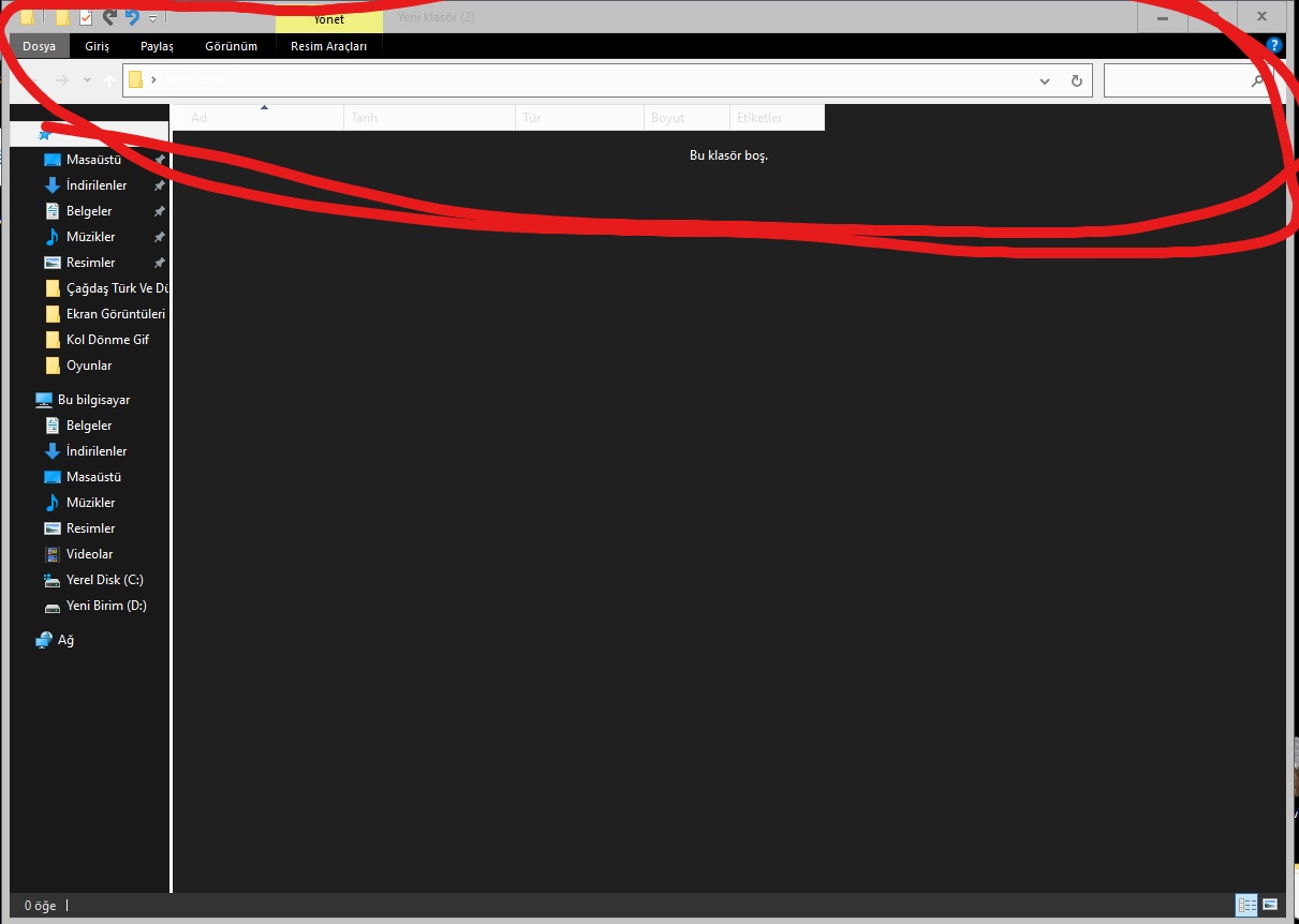 Herhangi bir klasör açınca rengi fotoğraftaki gibi oluyor kırmızı ile işaretli yerde yazan yazılarda gözükmüyor yardım edebilrmisiniz?