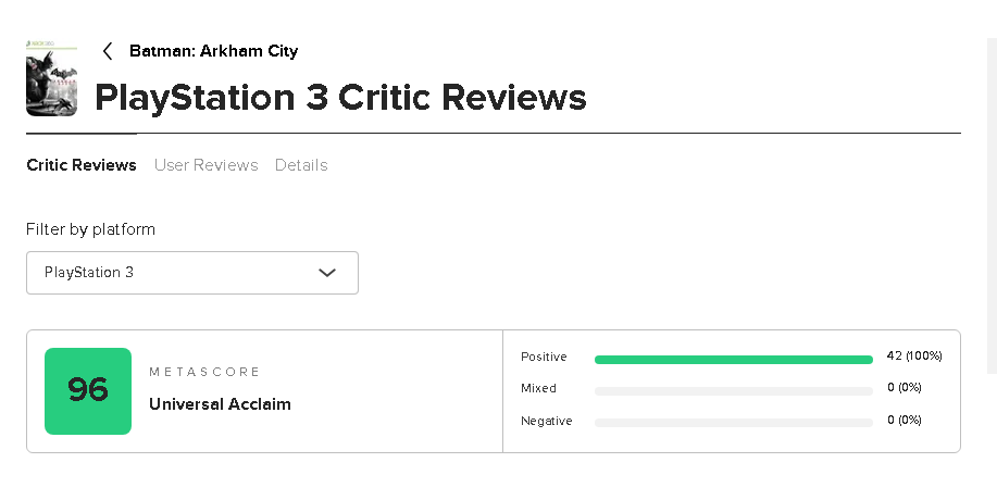 Oyunun en düşük incelendiği PS3 platformunu alıp Batman: Arkham City'nin puanını 96 gibi göstermek güzel taktikmiş KNK çabanı takdir ettim bu tür numaralar ile ancak kendin gibi cahilleri yutturursun bir oyunu inceleyen basın sayısı ne kadar yüksek olursa puanı da ona göre düşer karşılaştırdığın Marvel’s Spider-Man 2 149 basın tarafından incelenmiş aradaki devasa farkı görüyor musun attığın Batman: Arkham City ise 87 basın tarafından incelenerek 94 puan almış.