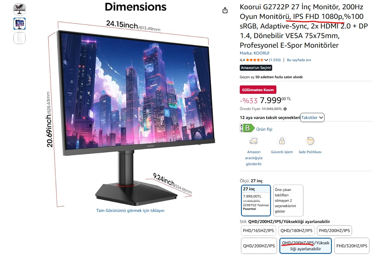 KOORUI G2722P 27-inç IPS QHD 200Hz Gaming Monitör 7.999,00 TL (amazon)