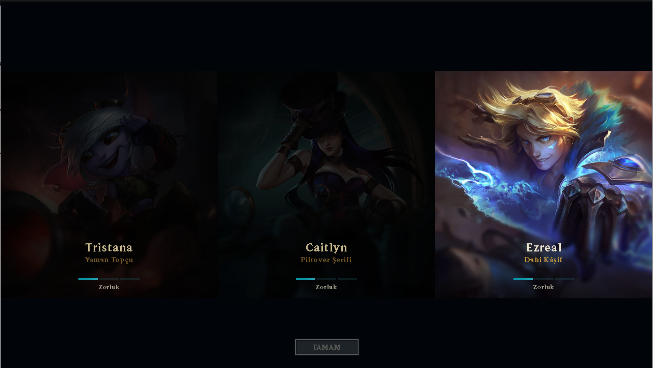 Arkadaşlar ben lol e yeni başladım ilk maçımı tamamladım sonra ilk şampiyonunu seç diye bi ekran geldi ezreal ın üstüne imlecimi götürüp seç dedim ondan sonra tamam a tıklamaya çalıştım olmadı bende silip tekrar yükledim oyunu yine oldu lolü her açtığımda bu ekran çıkıyo lütfen yardım edin