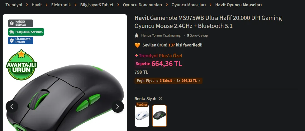 Peki bu mu yoksa logitech g102 mi?Plus üyeliği ilk ay ₺1 ücretsiz kargo ile ₺664 geliyor. Hem kablosuz hem de özellikleri bu fiyata göre iyi.