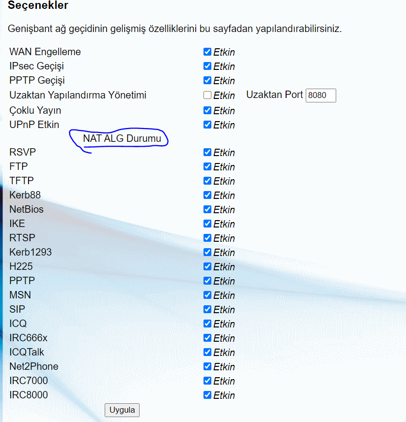 bak şunu yap ozaman port aç cihazına modem arayüzünden başka yöntemi yok o kablonet kullanan arkadaşının modemi büyük ihtimal eski.