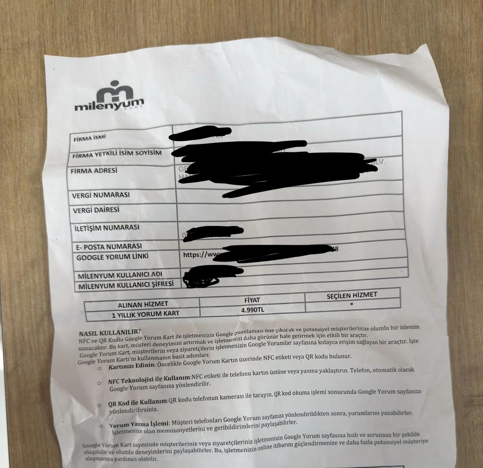 Bir yakınımızın dükkanının konumunu Google mapsa kaydettim adamı surkeli bir numara aramış ve Google maps dan aradıklarını kartı almazlarsa haritada ve Google aramalarimda çıkamayacaklarını söylemiş bana dediğinde şaşırdım önemsiz birseydir diye düşürdüm bugün ise bu kart gelmiş ve 5bin tl ödemesi çıkmış adam da zorunlu birsey zannedip almış