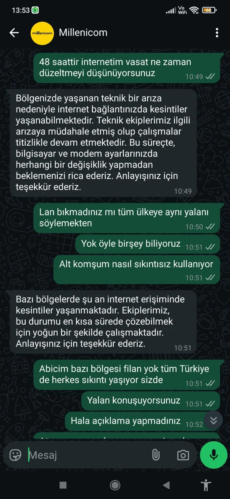 Merhaba, malum birkaç gündür Millenicom ve Netspeed'de ping ve paket kaybı gibi sorunlar yaşanıyor. Ancak şu an banka uygulamalarında para gönderirken sürekli 'gönderilemedi' tarzında hata mesajı alıyorum. Mobil veriye geçtiğimde ise hiçbir sorun olmuyor. Bilgisayarda da bazı siteler geç yükleniyor. Bu sorunu yaşayıp çözüm bulabilen var mı?"