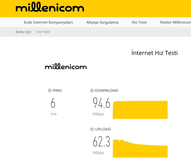 Millenicom’dan, 1000 Mbps olarak sattığı hizmetin hız sorununu kalıcı olarak çözmesini ve işimi aksatmayacak şekilde kararlı, kesintisiz ve taahhüt edilen hızda internet hizmeti sunmasını talep ediyorum. Aksi halde tüm yasal haklarımı kullanacağımı ve Tüketici Hakem Heyeti'ne başvuracağımı belirtmek isterim.